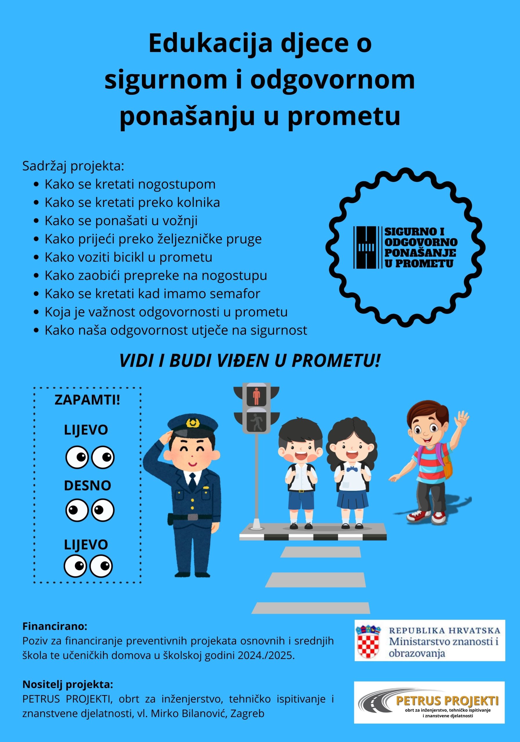 Projekt "Edukacija djece o sigurnom i odgovornom ponašanju u prometu" provodi se od školske godine 2024./2025. u osnovnim školama na području grada Zagreba. Projekt je u potpunosti financiran od strane Ministarstva znanosti, obrazovanja i mladih putem natječaja "Poziv za financiranje preventivnih projekata osnovnih i srednjih škola te učeničkih domova u školskoj godini 2024./2025."